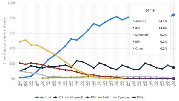 根據(jù)統(tǒng)計公司 Statista 公布的數(shù)據(jù),2016 年第一季度,Android 占據(jù)移動端操作系統(tǒng)市場份額的 84.1%,而第二名的 iOS 僅占 14.8%。Android 在移動端市場的主導(dǎo)地位絲毫沒被撼動。為了推新操作系統(tǒng)而拋棄 Android,明顯是不理智的。