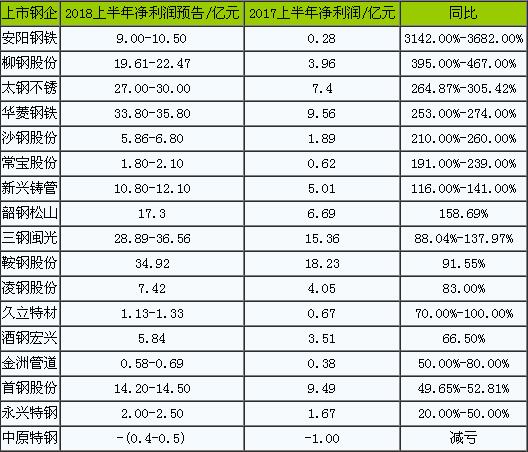 截止到7月16日,33家上市鋼企中已有17家發(fā)布2018年上半年業(yè)績預(yù)告,總計盈利約為230.03億元。其中,16家預(yù)增,1家減虧。其中,鞍鋼股份2018上半年預(yù)計盈利34.92億元,占據(jù)榜首。上半年利潤增長最快的是安陽鋼鐵,增長3142%-3682%。