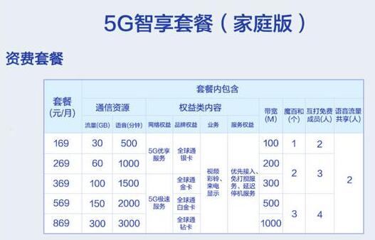 中國(guó)移動(dòng)5G套餐家庭版也分為5檔,169元、269元、369元、569元、869元,具體套餐詳情如下: