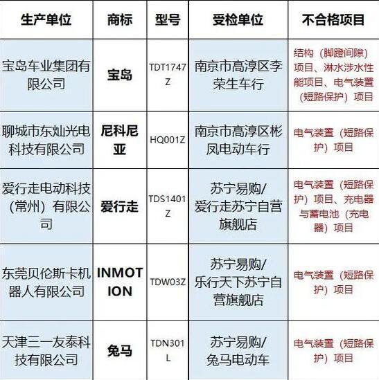 2019年8月28日,原北京市工商行政管理局網(wǎng)站公示的電動自行車類商品質量抽查檢驗結果顯示,3款標稱寶島品牌電動自行車抽檢不合格——標稱寶島公司生產的標稱寶島電動自行車(標稱型號、規(guī)格: TDT1698Z)被檢出欠壓、過流保護功能、最高車速、整車質量、腳踏行駛能力、反射器和鳴號裝置項目不合格;標稱該公司生產的標稱寶島電動自行車(標稱型號、規(guī)格: TDT0342Z)被檢出欠壓、過流保護功能、最高車速、把立管靜負荷、反射器和鳴號裝置項目不合格;標稱該公司生產的標稱寶島電動自行車(標稱型號、規(guī)格: TDT1705Z)被檢出最高車速、整車質量、腳踏行駛能力、反射器和鳴號裝置項目不合格。