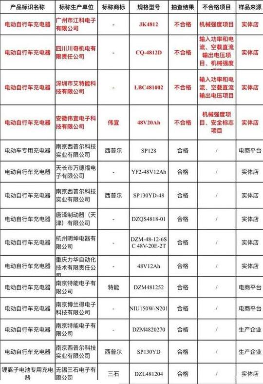 在本次抽檢中,還檢出4批電動自行車充電器和1批電池不合格,如下圖所示: