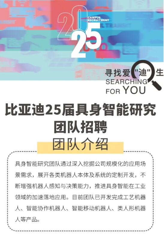 12月17日消息,人形機(jī)器人領(lǐng)域又迎來一家巨頭參戰(zhàn)。12月13日,“比亞迪招聘”公眾號(hào)發(fā)布25屆具身智能研究團(tuán)隊(duì)專場(chǎng)招聘信息。招聘崗位包括高級(jí)算法工程師、高級(jí)結(jié)構(gòu)工程師、高級(jí)仿真工程師等,研究方向涉及人形機(jī)器人、雙足機(jī)器人等多個(gè)維度,面向人群為 2025 屆全球高校碩士、博士畢業(yè)生。