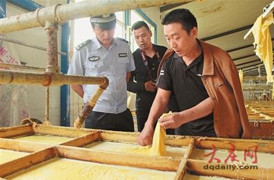 9月初,綜合連日蹲坑守候、秘密偵查和從周圍居民了解來的情況,市公安局治安支隊確定這是一處以大豆為原料生產(chǎn)腐竹、豆皮等食品的黑加工點,而且還存在使用有毒原料作為食品添加劑的情況。此外,該加工點的負責人李某、郭某都是河南人,在大慶周邊雇傭了不少工人,吃住都在工廠里。