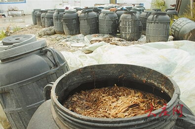 在工廠內(nèi),排列成“U”字形的廠房分為加工區(qū)、生活區(qū)和負責人的居所和化驗室。廠房中央的空地上,堆放著大量的黑色塑料桶,掀開塑料桶蓋,里面裝面了已成變成褐色的金針菇。
