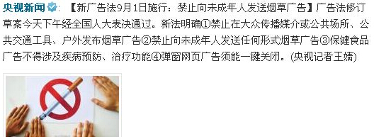 【新廣告法9月1日施行:禁止向未成年人發(fā)送煙草廣告】廣告法修訂草案今天下午經(jīng)全國人大表決通過。新法明確①禁止在大眾傳播媒介或公共場所、公共交通工具、戶外發(fā)布煙草廣告②禁止向未成年人發(fā)送任何形式煙草廣告③保健食品廣告不得涉及疾病預(yù)防、治療功能④彈窗網(wǎng)頁廣告須能一鍵關(guān)閉。(央視記者王婧)
