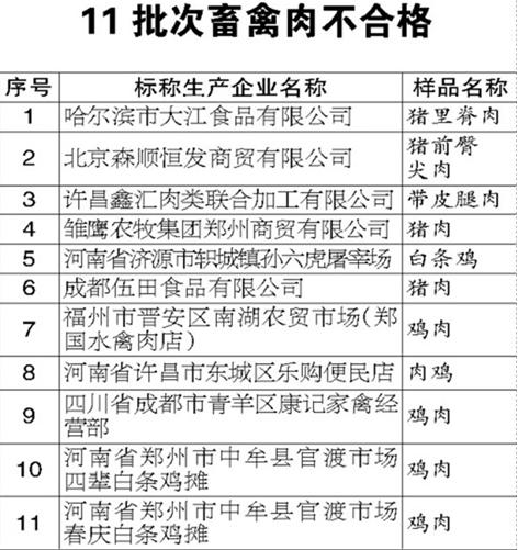 記者從省食藥監(jiān)局獲悉,國(guó)家食品藥品監(jiān)督管理總局近日抽檢420批次畜禽肉,有11批次不合格,被檢出沙丁醇胺(俗稱“瘦肉精”)等禁用獸藥。其中,在我市南崗區(qū)革新街地下人和革新市場(chǎng)抽檢的哈爾濱市大江食品有限公司生產(chǎn)的豬里脊肉及在沃爾瑪友誼路店抽檢的北京森順恒發(fā)商貿(mào)有限公司生產(chǎn)的豬前臀尖肉,均被檢出禁用獸藥沙丁胺醇。