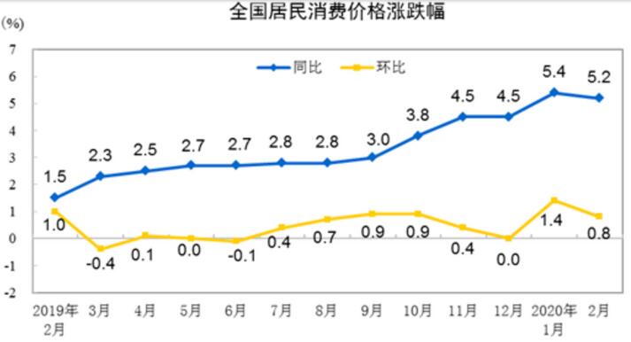 2月份,全國居民消費價格環(huán)比上漲0.8%。其中,城市上漲0.8%,農(nóng)村上漲0.9%;食品價格上漲4.3%,非食品價格下降0.2%;消費品價格上漲1.4%,服務價格下降0.2%。