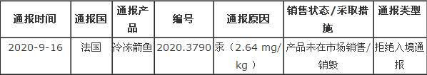 據歐盟食品和飼料快速預警系統(tǒng)(RASFF)消息,2020年9月16日,法國通過RASFF通報來自莫桑比克的冷凍箭魚不合格。具體通報內容如下: