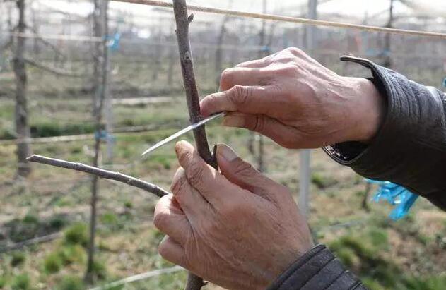 涂藥法:春季在芽眼處,用含赤霉素2.7%或3%的赤霉素羊毛脂膏(梨膨大劑)涂抹,用量為微量。擠出一點藥膏,抹在指頭上涂抹8~10個芽眼,速度比刻芽快且效果極好。