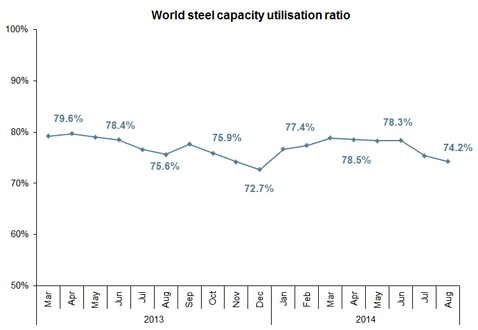 2014年8月全球65個(gè)國(guó)家的粗鋼產(chǎn)能利用率同比下降了1.4個(gè)百分點(diǎn),為74.2%,環(huán)比下降1.2個(gè)百分點(diǎn)。
