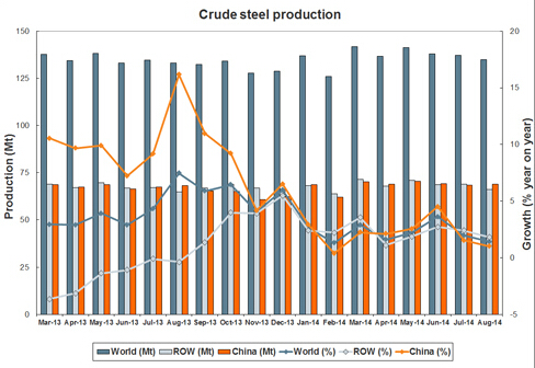 據(jù)世界鋼協(xié)統(tǒng)計(jì)數(shù)據(jù),2014年8月,全球65個(gè)納入國(guó)際鋼鐵協(xié)會(huì)統(tǒng)計(jì)的國(guó)家的粗鋼總產(chǎn)量達(dá)到1.35億噸,同比提高1.4%。