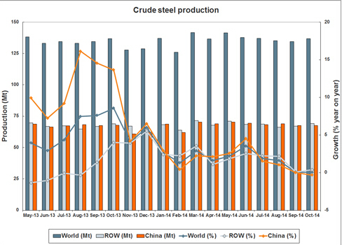 2014年10月,全球65個納入國際鋼鐵協(xié)會統(tǒng)計的國家的粗鋼總產(chǎn)量達(dá)到1.37億噸,同比持平。