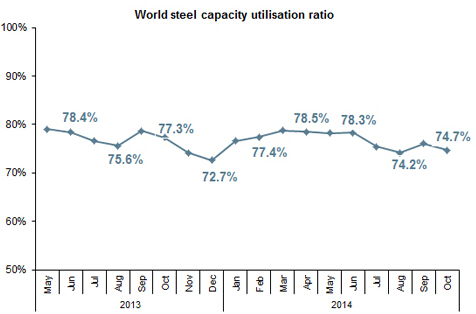 2014年10月全球65個國家的粗鋼產(chǎn)能利用率同比下降了2.6個百分點(diǎn),為74.7%,環(huán)比提升1.4個百分點(diǎn)。