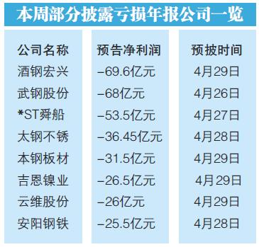 目前已經(jīng)披露年報(bào)的上市公司中,業(yè)績(jī)最差的為重慶鋼鐵,虧損59.87億元,但是本周卻有兩家上市公司將發(fā)布年報(bào),而且業(yè)績(jī)虧損都將超過(guò)重慶鋼鐵,其中酒鋼宏興預(yù)告凈利潤(rùn)為虧損69.6億元,武鋼股份預(yù)告的凈利潤(rùn)虧損為68億元。