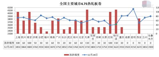 12月28日扁平材指數(shù)報(bào)121.68點(diǎn),較上一交易日上漲1.00%。其中,熱軋板卷指數(shù)和中厚板指數(shù)分別上漲1.35%和上漲0.68%。今日熱卷期貨1705全天寬幅震蕩,現(xiàn)3405漲2.31%,放量增倉(cāng)。4.75熱軋板卷市場(chǎng)價(jià)格大幅上漲。上海、南京、廣州、武漢、京津冀、沈陽、西安等20個(gè)城市價(jià)格上漲10—110元/噸,其中上海、南京、天津、沈陽、哈爾濱市場(chǎng)價(jià)格上漲超百元。據(jù)統(tǒng)計(jì),全國(guó)24個(gè)市場(chǎng)4.75mm熱軋板卷價(jià)格報(bào)3804元/噸,較上一交易日價(jià)格上漲49元/噸。