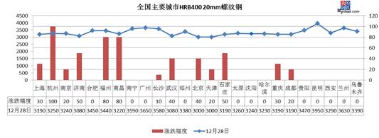 12月28日國(guó)內(nèi)鋼材指數(shù)(Myspic)綜合指數(shù)報(bào)128.26點(diǎn),較上一交易日上漲0.68%。鐵礦石價(jià)格指數(shù)(MyIpic)綜合指數(shù)報(bào)81.3點(diǎn),較上一交易日持平。在黑色系期貨震蕩走強(qiáng)下,疊加成交有所增加,商家積極拉漲。特別在午后鋼坯大漲80至2830元/噸后,市場(chǎng)做多情緒攀升,加之鋼廠定價(jià)堅(jiān)挺,成本面尚有支撐。但年底需求萎縮和資金面壓力不容忽視,期貨尾盤的回落帶給市場(chǎng)不穩(wěn)因素,綜合預(yù)計(jì)短期市場(chǎng)價(jià)格或?qū)⒄鹗幤珡?qiáng),力度有限。