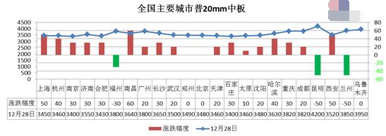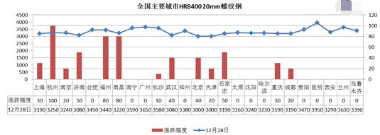 12月28日長材指數(shù)報135.14點,較上一交易日上漲0.39%。今日期螺1705全天沖高回落,現(xiàn)2989漲1.98%,放量增倉。今日建材現(xiàn)貨市場價格穩(wěn)中有漲。上海、濟南、北京、重慶、福州等13個城市螺紋鋼價格上漲10-100元/噸。據(jù)統(tǒng)計,全國25個主要市場HRB400(20mm)螺紋鋼價格報3327元/噸,較上一交易日價格上漲23元/噸。
