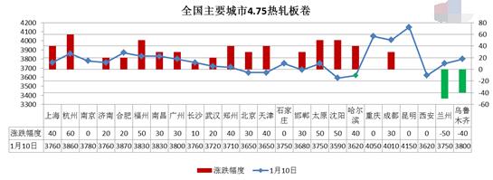 1月10日扁平材指數(shù)報(bào)120.68點(diǎn),較上一交易日上漲0.40%。其中,熱軋板卷指數(shù)和中厚板指數(shù)分別上漲0.64%和上漲0.21%。今日熱卷期貨1705尾盤(pán)封漲停,現(xiàn)3562漲7.00%,縮量增倉(cāng)。4.75熱軋板卷市場(chǎng)價(jià)格震蕩上漲,上海、杭州、廣州、武漢、京津、沈陽(yáng)等17個(gè)城市價(jià)格上漲20—60元/噸;僅蘭州、烏魯木齊市場(chǎng)價(jià)格下跌40—50元/噸。據(jù)統(tǒng)計(jì),全國(guó)24個(gè)市場(chǎng)4.75mm熱軋板卷價(jià)格報(bào)3781元/噸,較上一交易日價(jià)格上漲21元/噸。
