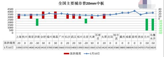 國(guó)內(nèi)中厚板市場(chǎng)價(jià)格整體盤(pán)整運(yùn)行。上海、合肥、武漢、天津、太原市場(chǎng)價(jià)格上漲10元/噸—30元/噸;濟(jì)南、北京、蘭州市場(chǎng)價(jià)格下跌20元/噸—50元/噸。據(jù)統(tǒng)計(jì),全國(guó)23個(gè)主要市場(chǎng)普20mm中板價(jià)格報(bào)3542元/噸,較上一交易日價(jià)格上漲2元/噸。