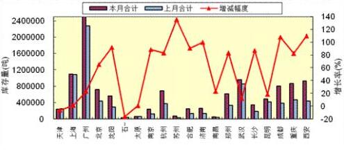 本月螺紋鋼庫存增加的地區(qū)有16個,其中增加較多的地區(qū)有上海,庫存增加0.5萬噸,全部為鋼材市場增加量;北京庫存增加25萬噸,沈陽18萬噸,南京1.4萬噸,杭州20.6萬噸,蘇州3.4萬噸,合肥6.4萬噸,濟(jì)南4.0萬噸,南昌0.4萬噸,鄭州19.3萬噸,武漢1.1萬噸,長沙8.3萬噸,昆明3.1萬噸,成都20.0萬噸,重慶16.9萬噸,西安31.5萬噸;庫存減少的地區(qū)有4個,其中減少較多的地區(qū)有天津,庫存減少1.0萬噸,全部為港口減少量;廣州庫存減少3.4萬噸,其中鋼材市場減少0.36萬噸,港口減少3.0萬噸;石家莊庫存減少0.2萬噸。