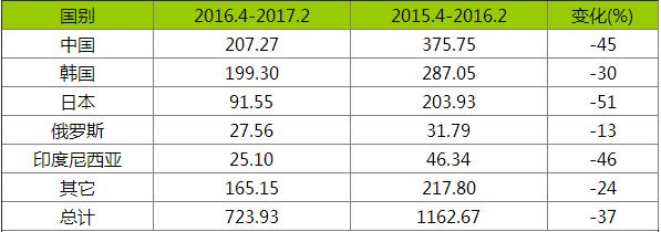 對(duì)印度三大出口國(guó)中國(guó)、韓國(guó)和日本受沖擊最為明顯。2016年4月至2017年2月,中國(guó)對(duì)印度總計(jì)出口鋼材207萬(wàn)噸,降45%,韓國(guó)出口199萬(wàn)噸,降30%,日本99.55萬(wàn)噸,降51%。其中,韓國(guó)對(duì)印度熱卷出口79.74萬(wàn)噸,同比降32%,日本出口45.05萬(wàn)噸,降60%。