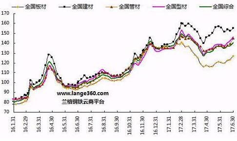 6月份,國(guó)內(nèi)鋼鐵市場(chǎng)呈現(xiàn)高位震蕩、小幅上漲局面,且建材、板材走勢(shì)出現(xiàn)分化。據(jù)蘭格鋼鐵云商平臺(tái)監(jiān)測(cè)數(shù)據(jù)顯示,截至6月30日,蘭格鋼鐵全國(guó)鋼材綜合價(jià)格指數(shù)為140.5,較上月末上升2.2%,年同比上升45.9%。其中,建材價(jià)格指數(shù)為155.1,較上月末下降1.3%,年同比上升55.7%;板材價(jià)格指數(shù)為127.0,較上月末上升4.8%,年同比上升35.9%;型材價(jià)格指數(shù)為146.3,較上月末上升5.3%,年同比上升49.6%;管材價(jià)格指數(shù)為144.9,較上月末上升5.5%,年同比上升51.6%(詳見(jiàn)圖1)。
