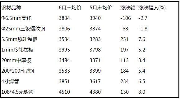 蘭格鋼鐵云商平臺(tái)監(jiān)測(cè)的8大鋼材品種10大城市均價(jià)顯示,截至6月30日,除高線和三級(jí)螺紋鋼有所下跌外,其他六個(gè)鋼材品種均有所上漲,其中熱軋卷板漲幅最大,為7.6%;無(wú)縫管漲幅最小,為3.0%;其他品種漲幅在3.4%-6.5%之間(詳見(jiàn)表1)。6月份由于建筑鋼材價(jià)格的下跌,板材價(jià)格上漲,冷軋卷板超越建筑鋼材價(jià)格,而熱軋卷板和中厚板與建筑鋼材價(jià)格差距縮小,其中熱軋卷板和三級(jí)螺紋鋼價(jià)差由5月末的591元下降為6月末的272元。。表1 10大城市8大鋼材品種價(jià)格漲跌情況表