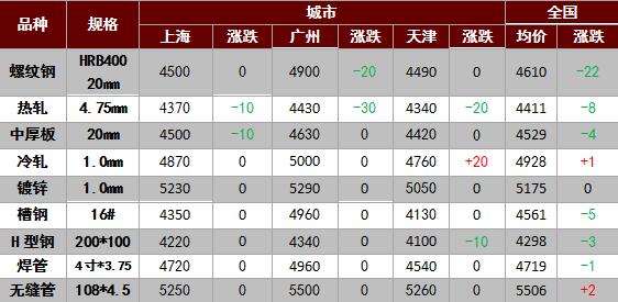 建筑鋼材:今日國(guó)內(nèi)建筑鋼材價(jià)格小幅下跌。具體價(jià)格來(lái)看,全國(guó)25個(gè)主要城市均價(jià)4610元/噸,較上一交易日價(jià)格下跌22元/噸,其中南寧、長(zhǎng)沙和成都三地下跌明顯,跌幅均超50元/噸,其余地區(qū)價(jià)格均小幅松動(dòng),僅東北地區(qū)價(jià)格持穩(wěn)。具體來(lái)看,今日開市期貨震蕩走弱,現(xiàn)貨市場(chǎng)交投氛圍不佳,商家報(bào)價(jià)下調(diào),低位資源頻現(xiàn),午后隨著期螺的下挫,現(xiàn)貨價(jià)格繼續(xù)走低。23日我網(wǎng)所盤35城社會(huì)庫(kù)存螺紋437.38減4.89,線材131.48增4.16,鋼廠庫(kù)存螺紋 163.27減0.23,線材49.29增3.44。建材庫(kù)存整體低位,貿(mào)易商出貨壓力不大,不過(guò)由于成交受阻、資金趨緊,加之前期價(jià)格大幅拉漲,商家獲利資源較多,部分商家有成交套現(xiàn)操作?傮w來(lái)看,預(yù)計(jì)明日國(guó)內(nèi)建材價(jià)格或呈窄幅調(diào)整態(tài)勢(shì)運(yùn)行。