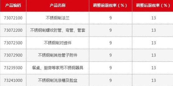 根據(jù)財(cái)稅〔2018〕123號文件,為進(jìn)一步簡化稅制、完善出口退稅政策,對部分產(chǎn)品增值稅出口退稅率進(jìn)行調(diào)整,11月1日起執(zhí)行。其中涉及部分不銹鋼出口制品: