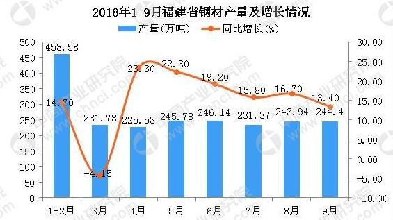 據(jù)中商產(chǎn)業(yè)研究院數(shù)據(jù)庫顯示,2018年3-9月福建省鋼材產(chǎn)量呈小幅度波動狀態(tài),整體有所增長;2018年9月福建省鋼材產(chǎn)量為244.4萬噸,同比增長13.4%。2018年1-9月福建省鋼材產(chǎn)量為2074.36萬噸,同比增長15.5%。