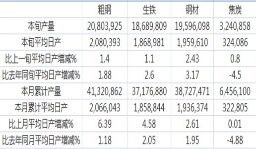 根據(jù)重點統(tǒng)計鋼鐵企業(yè)產(chǎn)量估算,本旬全國共生產(chǎn)粗鋼2758.95萬噸,日產(chǎn)粗鋼275.89萬噸、環(huán)比增長1.27%、同比下降2.464.56%;生產(chǎn)生鐵2299.61萬噸,日產(chǎn)生鐵229.96萬噸、環(huán)比增長0.83%、同比下降2.57%;生產(chǎn)鋼材3352.99萬噸,日產(chǎn)鋼材335.30萬噸、環(huán)比增長2.78%、同比增長1.98%。本月累計平均日產(chǎn),全國粗鋼環(huán)比下降0.15%、同比下降0.05%,生鐵環(huán)比增長0.56%、同比增長2.15%,鋼材環(huán)比下降1.30%、同比增長6.66%。