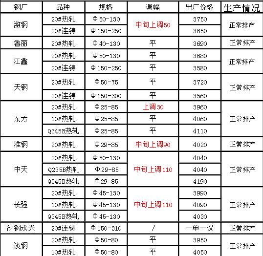 國(guó)內(nèi)管坯出廠價(jià)調(diào)價(jià)上調(diào)為主,其中,濰鋼20#熱軋、20#連鑄上調(diào)50元/噸,20#熱軋上調(diào)30元/噸,20#熱軋上調(diào)90元/噸,中天20#熱軋、Q235B熱軋、Q345B上調(diào)110元/噸,長(zhǎng)強(qiáng)20#熱軋、10#熱軋、Q345#熱軋上調(diào)110元/噸。