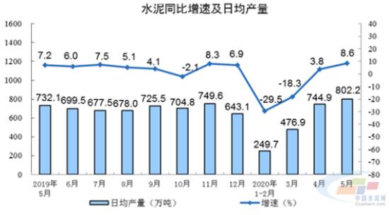 中國水泥網(wǎng)消息,根據(jù)國家統(tǒng)計局數(shù)據(jù)顯示,2020年1-5月份,全國累計水泥產(chǎn)量7.69億噸,同比下降8.2%;5月份水泥24869萬噸,增長8.6%。
