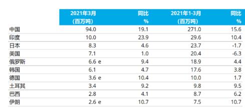 2021年1-3月粗鋼產(chǎn)量累計前十位的國家
