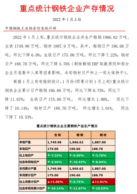 2022年1月上旬,重點(diǎn)統(tǒng)計(jì)鋼鐵企業(yè)共生產(chǎn)粗鋼1966.62萬噸、生鐵1749.98萬噸、鋼材18870萬噸。其中,粗鋼日產(chǎn)196.66萬噸,環(huán)比下降60%;生鐵日產(chǎn)17500萬噸,環(huán)比下降722%;鋼材日產(chǎn)18870萬噸,環(huán)比下降376%(剔除鞍鋼ERP取數(shù)原則和部分企業(yè)月底集中入庫等因素影響,本旬鋼材日產(chǎn)和上一旬大體持平)。