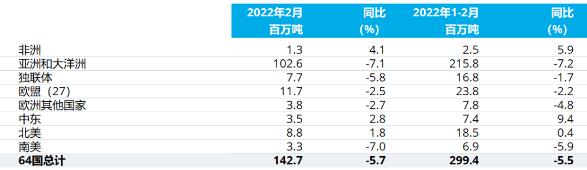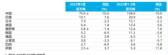 2022年2月全球64個(gè)納入世界鋼鐵協(xié)會(huì)統(tǒng)計(jì)國家的粗鋼產(chǎn)量為1.427億噸,同比下降5.7%。