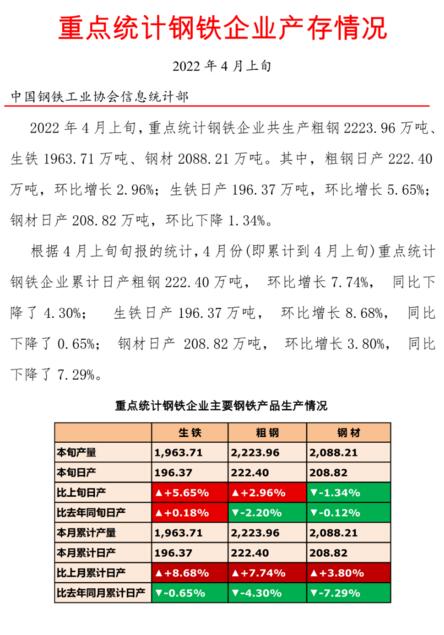 2022年4月上旬,重點(diǎn)鋼企粗鋼日均產(chǎn)量222.40萬(wàn)噸,環(huán)比增長(zhǎng)2.96%;鋼材庫(kù)存量1848.81萬(wàn)噸,比上一旬(即上月底)增加186.81萬(wàn)噸,增長(zhǎng)11.24%。