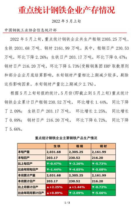 中鋼協(xié)最新數(shù)據(jù)顯示,5月上旬重點鋼企粗鋼日產(chǎn)230.53萬噸,環(huán)比下降2.26%;鋼材庫存量1874.85萬噸,比上一旬增長3.65%,比上月同旬增長1.41%。