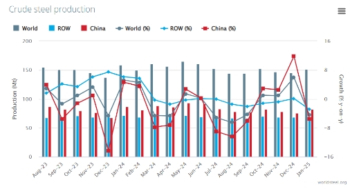據(jù)世界鋼鐵協(xié)會,2025年1月全球粗鋼產(chǎn)量為1.514億噸,同比下降4.4%。