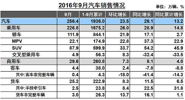 1-9月,基本型乘用車(轎車)產(chǎn)銷846.28萬輛和844.12萬輛,同比增長3.08%和2.70%;運動型多用途乘用車(SUV)產(chǎn)銷607.77萬輛和599.92萬輛,同比增長46.01%和45.91%;多功能乘用車(MPV)產(chǎn)銷173.54萬輛和174.91萬輛,同比增長18.49%和22.93%;交叉型乘用車產(chǎn)銷54.18萬輛和56.26萬輛,同比下降34.49%和33.46%。