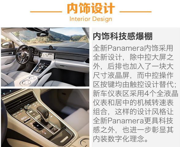 內(nèi)飾方面:全新Panamera采用全新設(shè)計,最大的特點就是大量應(yīng)用了觸摸按鍵,并配有新一代保時捷通訊管理系統(tǒng)(PCM)的12.3英寸中控液晶觸摸屏,駕駛者和前排乘客可以分別對顯示屏進行操作,其功能包括在線導(dǎo)航、保時捷互聯(lián)在線功能以及通過