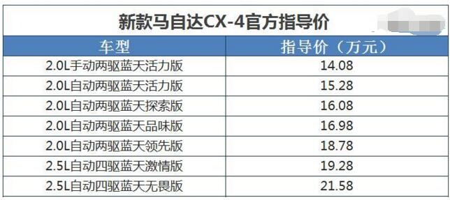 動力方面:新款馬自達(dá)CX-4依舊配備2.0L和2.5L兩款“創(chuàng)馳藍(lán)天”發(fā)動機(jī),其中2.5L發(fā)動機(jī)最大功率192馬力/6100rpm,峰值扭矩252Nm/4000rpm;2.0L發(fā)動機(jī)最大功率158馬力/6400rpm,峰值扭矩202Nm/4000rpm。而除了入門車型外,新款馬自達(dá)CX-4均匹配一臺SKYACTIV-Drive的6速手自一體變速箱。