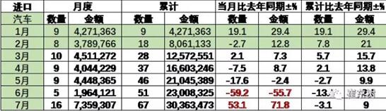 7月,我國共進(jìn)口汽車16萬輛,同比增長53%;進(jìn)口總額為73.6億美元,同比增長72%。其中,7月進(jìn)口小轎車6.6萬輛,同比增長68%,環(huán)比增長363%;進(jìn)口四驅(qū)SUV車型6.8萬輛,同比增長33%,環(huán)比增長190%。