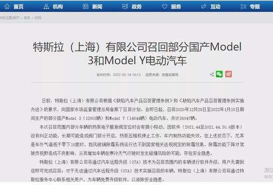 2月18日,國(guó)家市場(chǎng)監(jiān)管總局發(fā)布消息稱,日前,特斯拉(上海)有限公司根據(jù)《缺陷汽車(chē)產(chǎn)品召回管理?xiàng)l例》和《缺陷汽車(chē)產(chǎn)品召回管理?xiàng)l例實(shí)施辦法》的要求,向國(guó)家市場(chǎng)監(jiān)督管理總局備案了召回計(jì)劃。