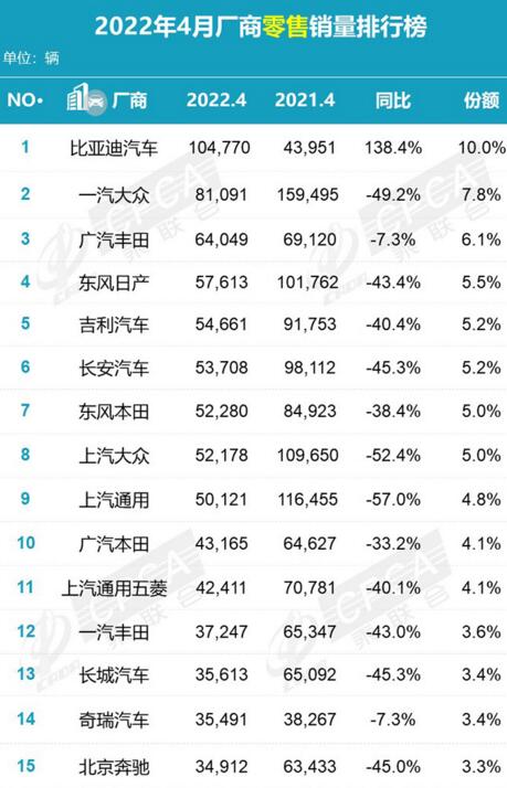 中新財經(jīng)注意到,4月,自主品牌多年來首次超越合資品牌,登頂國內(nèi)月度汽車銷量排行榜。比亞迪月銷量超10.47萬輛,同比增長138.4%,排名第一。第二名和第三名分別是一汽-大眾和廣汽豐田。