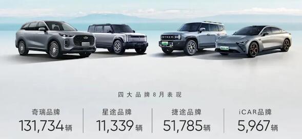 奇瑞品牌8月銷量為131,734輛,1-8月累計(jì)銷量為961,624輛,同比增長34.8%;