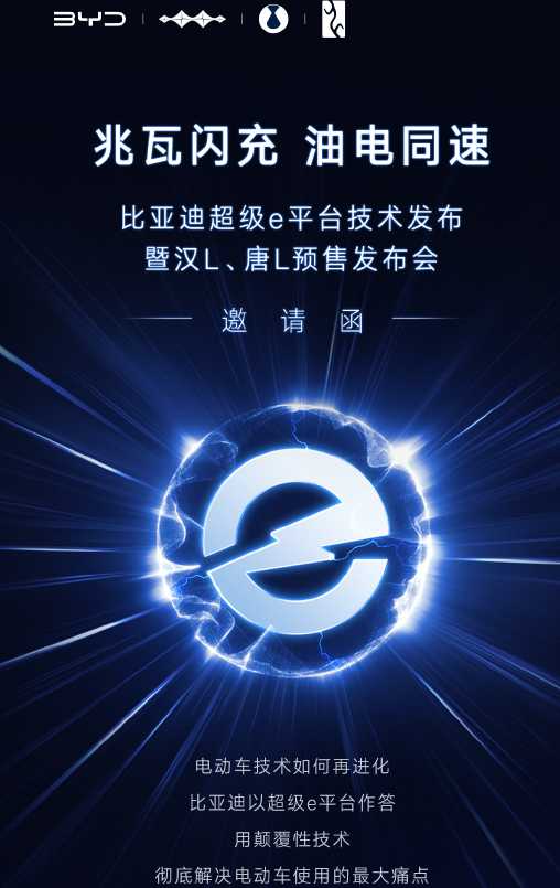 邀請函上的消息顯示,比亞迪此次將推出超級e平臺技術(shù),解決電動車使用的最大痛點,還提到了“兆瓦閃充 油電同速”。