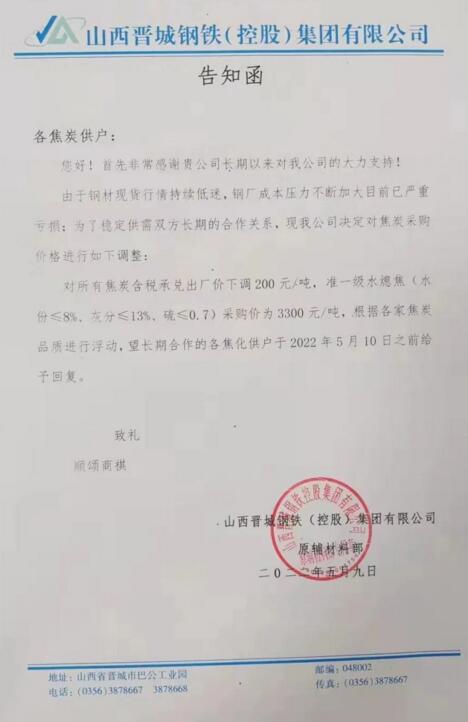焦炭市場全面落實第一輪降價,降幅為200元/噸。昨日,有鋼廠發(fā)出采購焦炭的調(diào)價函。函中指出:“鋼材現(xiàn)貨行情持續(xù)低迷,鋼廠成本壓力不斷加大目前已嚴(yán)重虧損為了穩(wěn)定供需雙方長期的合作關(guān)系,現(xiàn)我公司決定對焦炭采購價格進行如下調(diào)整:對所有焦炭含稅承兌出廠價下調(diào)200元/噸,望長期合作的各焦化供戶于2022年5月10日之前給予回復(fù)!