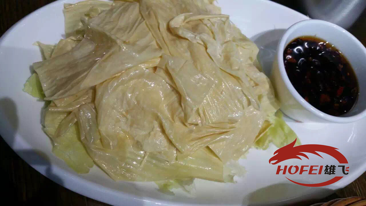 蓋布卷好后再將帶有豆腐皮的底布,以同上方法進(jìn)行剝皮卷布,在剝皮過(guò)程中可以停機(jī)3-4次,分次將剝下的豆腐皮拿出來(lái).