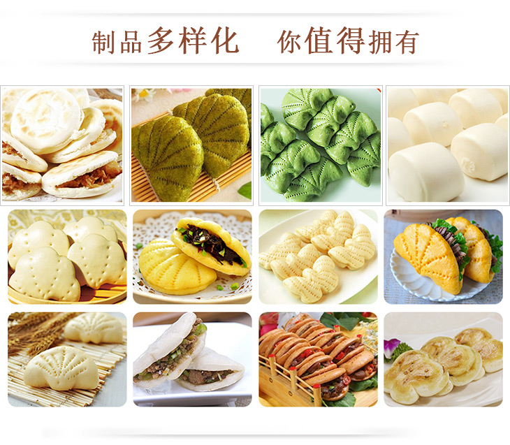3、旭眾牌荷葉夾機的產品多樣化,可生產各種刀切饅頭、荷葉夾、蝴蝶夾、肉夾饃等。將面帶通過主機整壓,卷成條胚,由刀切機構成形,制出成品,并使產品有光澤,有筋度,保持純仿手工的工藝及口味。